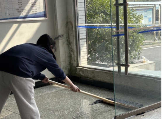 在老师们的带领下,志愿者们将体育训练馆前马路、一楼走廊、卫生间、所有楼梯间、二楼办公室及会议室等都清扫得干干净净。(审核:郭羽)