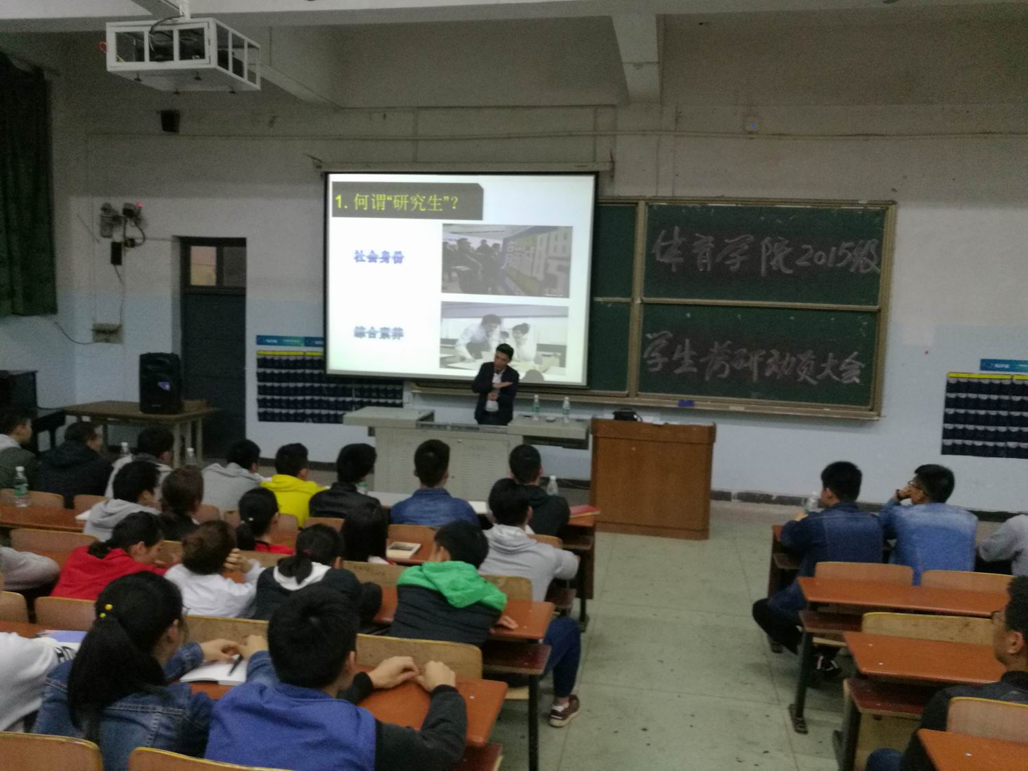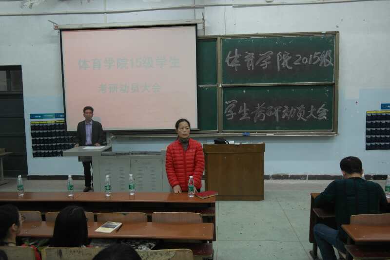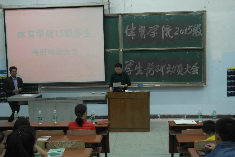 (通讯员 郭羽)人才培养质量是高等学校的生命线,提高教学质量是高校永恒的主题”,学校“十三五规划”和第三届党代会报告将学生考研工作纳入到了学校人才培养质量的核心指标体系,国产va无马网站围绕学校、学院的中心工作,让同学们进一步了解考研、认识考研、明确目标、确定方向,激发学生考研的内在动力,充分调动学生考研的积极性和创造性学习的热情,提高考研报考率和录取率,推进和巩固学院的学风建设,4月26日晚上7:30,国产va无马网站在一教学楼107教室举行了2015级学生考研动员大会暨考研经验交流会。出席动员会的领导和老师有学院党总支部书记薛铁军、副院长李志宏(主持工作)、党总支部副书记郭羽、副院长舒宗礼、社体系主任兼考研班班主任戴志鹏、体育教育系主任龚莹莹、办公室主任王雄鹰、全体辅导员、2015级所有班主任,参加会议的有2014级录取研究生的同学,2015级、2016、2017级准备考研同学共150人。会议由学院党总支副书记郭羽主持。